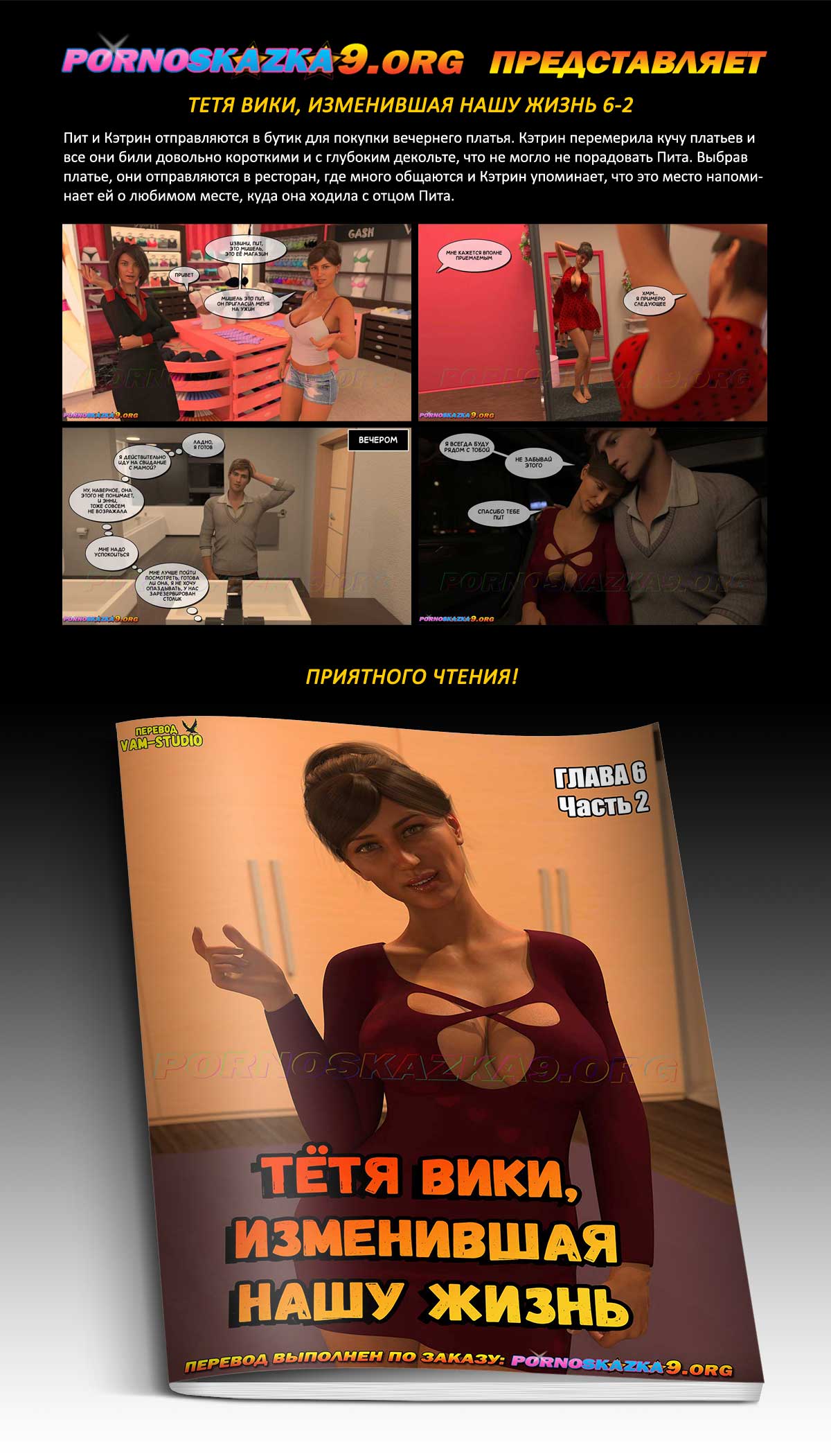 Порно комикс «Тетя Вики, изменившая нашу жизнь. Глава 6. Часть 2.» Пит и Кэтрин отправляются в бутик для покупки вечернего платья. Кэтрин перемерила кучу платьев и все они били довольно короткими и с глубоким декольте, что не могло не порадовать Пита. Выбрав платье, они отправляются в ресторан, где много общаются и Кэтрин упоминает, что это место напоминает ей о любимом месте, куда она ходила с отцом Пита.